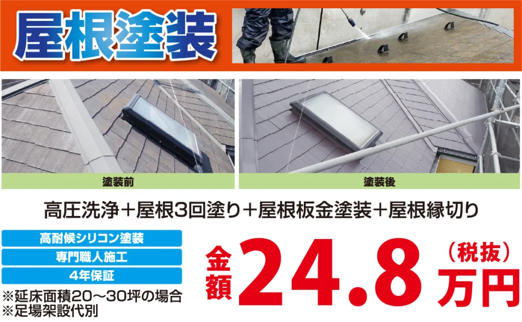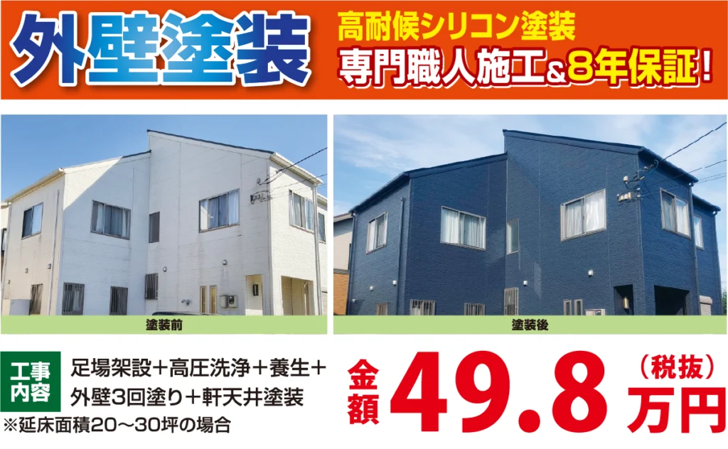 ※上記費用には、足場代、高圧洗浄、下地処理、3回塗り(下塗り・中塗り・上塗り)、諸経費などが含まれています。